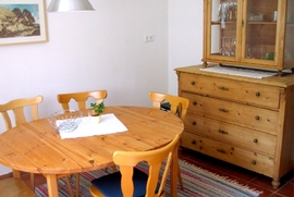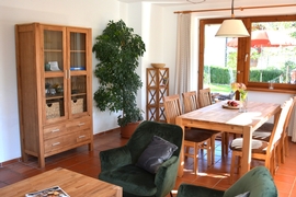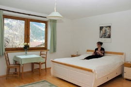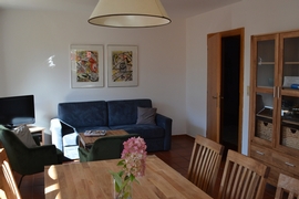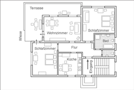 Die Wohnung hat ca. 100 m2, das Wohnzimmer und die beiden Schlafzimmer sind jeweils über 20 m2, die Küche ca. 13 m2 groß. Die Whg. ist für 4 bis 5 Personen großzügig geschnitten. Die Sitzcouch im Wohnzimmer kann zum Schlafen genutzt werden. Die Whg. ist komfortabel ausgestattet: Fußbodenheizung; Einbauküche mit Backofen und Spülmaschine; Badezimmer mit Dusche, Badewanne und Bidet, Kosmetikspiegel, eine zusätzliche Toilette; im WoZi Fernsehgerät mit Satellitenanschluss, Radioanlage und kostenloser Internetzugang (WLAN). Vor der Whg. befndet sich südseitig eine große Terrasse, an die sich eine Liegewiese und zum Westen ein großer Balkon anschließen.